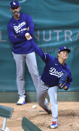 米大リーグ、ドジャースの山本が14日(日本時間15日)に行われるブルワーズとのナ・リーグ優勝決定シリーズ第2戦に先発することが決まった。写真は、ブルペンで投球練習する山本=12日、ミルウォーキー 【時事通信社】