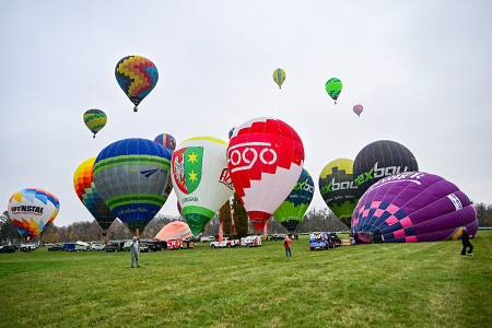 9日、ポーランド西部ウロツワフで、次々に上空に向けて飛ぶ色とりどりの熱気球。3日間にわたって開かれるこの「ウロツワフ市長杯バルーンフェスタ」では、約30機が空を舞うという。 【EPA時事】