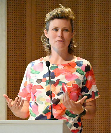 11日、シドニーで講演する核兵器廃絶国際キャンペーン(ICAN)オーストラリア代表のジェム・ロムルド氏。トランプ米大統領が核実験再開を指示したことについて「非常に懸念している」と厳しく批判した。 【時事通信社】