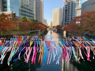 「目黒川オータムプロムナード」山本橋側のリボン。秋をイメージしたオレンジ色や茶色