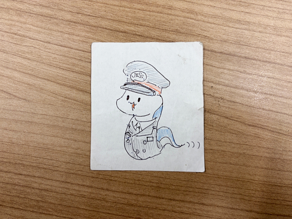 「にしにょろくん」手描きの初期デザイン案。イラスト制作が趣味だという駅員が描いた