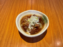もつ焼きは芝浦直送のモツを仕入れ、自社独自のたれを使う。レバー、はつ、タン下、かしら、ハラミ、しろ(以上187円)、タン(209円)、豚ばら(275円)、「月見つくね」(385円)など。串カツは、オランダ産ラードの揚げ油を使い、ヤマイモをブレンドした衣で外はカリッと、中はふわっと仕上げる。とうもろこし(143円)、豚ばら(209円)、紅ショウガ、牛、鶏むね、シイタケ(以上176円)、レンコン、イカ(以上198円)など。