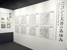 入り口付近の地図展示コーナーでは、同社付近の地図を年代ごとに並べる。鉄道や道路の建設、立会川の暗渠(あんきょ)化など、土地の変化が分かる地図をピックアップした。このほか、同社と大井地域に関係する23枚のエピソードボードと、大井地域の工場で生まれた24点のニコン製品を展示する。