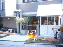 元コクヨ社員寮をリノベーションした賃貸住宅「THE CAMPUS FLATS TOGOSHI(キャンパスフラッツとごし)」1階に入居する路面店。白色を基調としたタイル貼りの内装と外装に、オレンジの看板が目を引く。テラス席には、犬用のリードフックを付けたベンチを設置する。席数は、店内=10席、テラス=約20席。店舗面積は約8坪。
