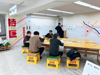 スペース面積は9坪。主な什器(じゅうき)はTOCの倉庫にあった廃棄予定のものを再利用する。「親しみやすく肩肘を張らない雰囲気で、かつ目を引くような場にしたかった」と猪股さん。斜めに置かれた大型テーブルを中心に、ビールケースを活用したスツールや可動式の人工芝スペースを設置する。壁にはマスキングテープで装飾や五反田の地図を制作し、「五反田のここが好き」「特区にあったらいいなと思うこと」といったお題単位のアイデアボードを掲示。利用者が付箋で自由に意見を貼れるようにした。