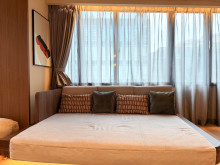 設計・デザイン担当の遠藤利紀さんは「部屋のコンセプトは『アーバンリトリート』で、天井の木目デザインや各所に施した間接照明が特徴」と話す。「『illi Pal』はカジュアルめで部屋の色味も淡いが、こちらは木目の色が濃く、随所で素材感を意識した。都心部にありながら騒音から離れ、より落ち着きある空間で心身をリフレッシュしてもらいたい」とも。