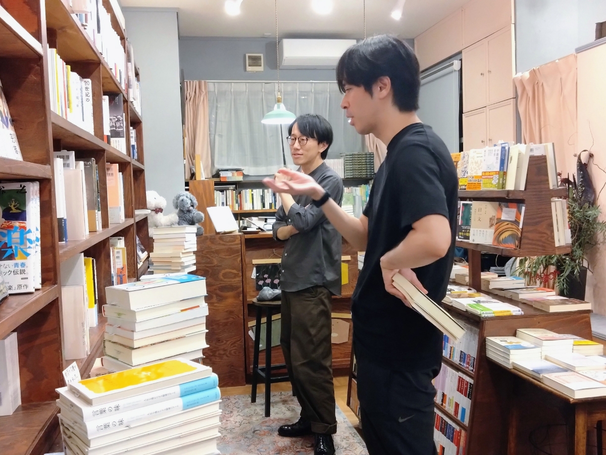 イベントについて相談する高﨑一さん(手前)とフラヌール書店店主の久禮亮太さん