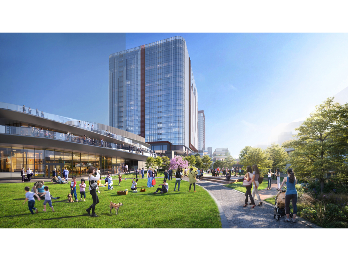 工事中の広場「TRACKS PARK」(左部)。中央の空き地には品川区役所の新庁舎が建設される