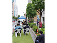 大井町駅中央通り(どんたく通り)で10月25日から、車道の一部を歩行者空間として開放する実証実験が行われている。