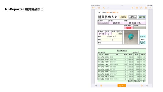月2.5時間かかっていた備品払い出しの入力・集計作業作業をゼロに。i-Reporterで部門・管理No.を入力すると、名称・単価が自動表示され、即座にkintoneに連携。kViewerで部門別使用金額を一覧化し、現場のコスト意識向上と無駄な発注防止を実現。記入漏れや転記ミスも大幅減少。