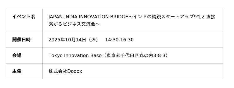 “行動で世の中を変えていく“を理念に掲げる株式会社Dooox(本社:東京都品川区、代表取締役:久保寺亮介)は、インドのアクセラレーター兼投資家であるGHV(GreenHouse Ventures)と共催にて、2025年10月14日(火)に、インドのスタートアップと日本企業による交流イベント「JAPAN-INDIA INNOVATION BRIDGE」をTokyo Innovation Baseにて開催いたしました。